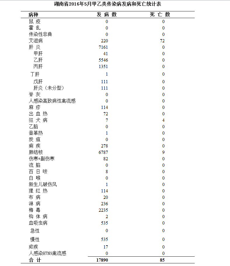 附件:湖南省2016年5月甲乙类传染病发病和死亡统计表