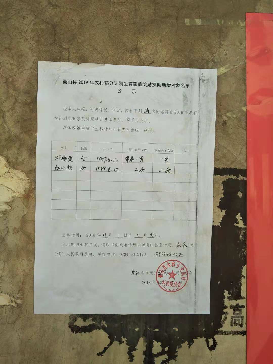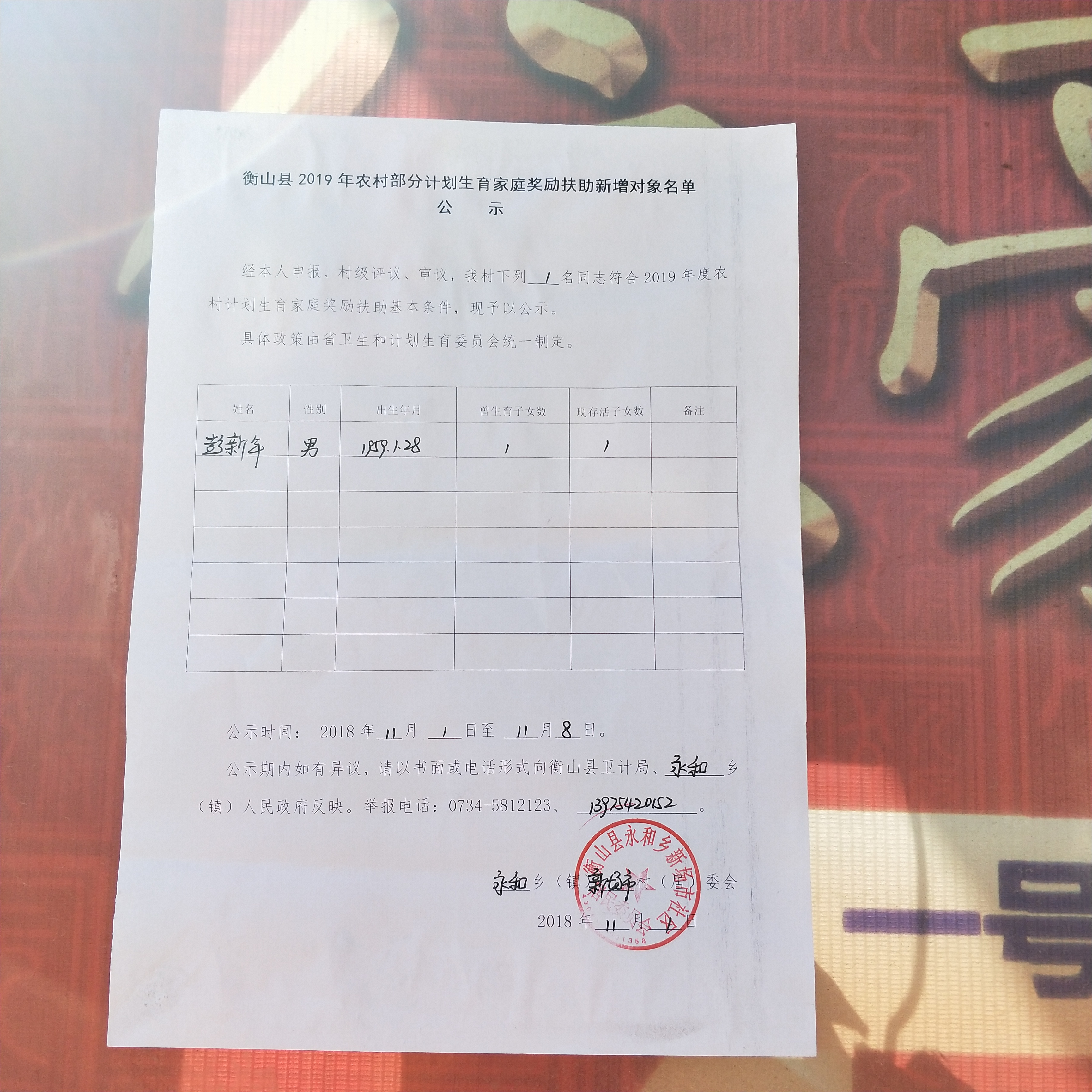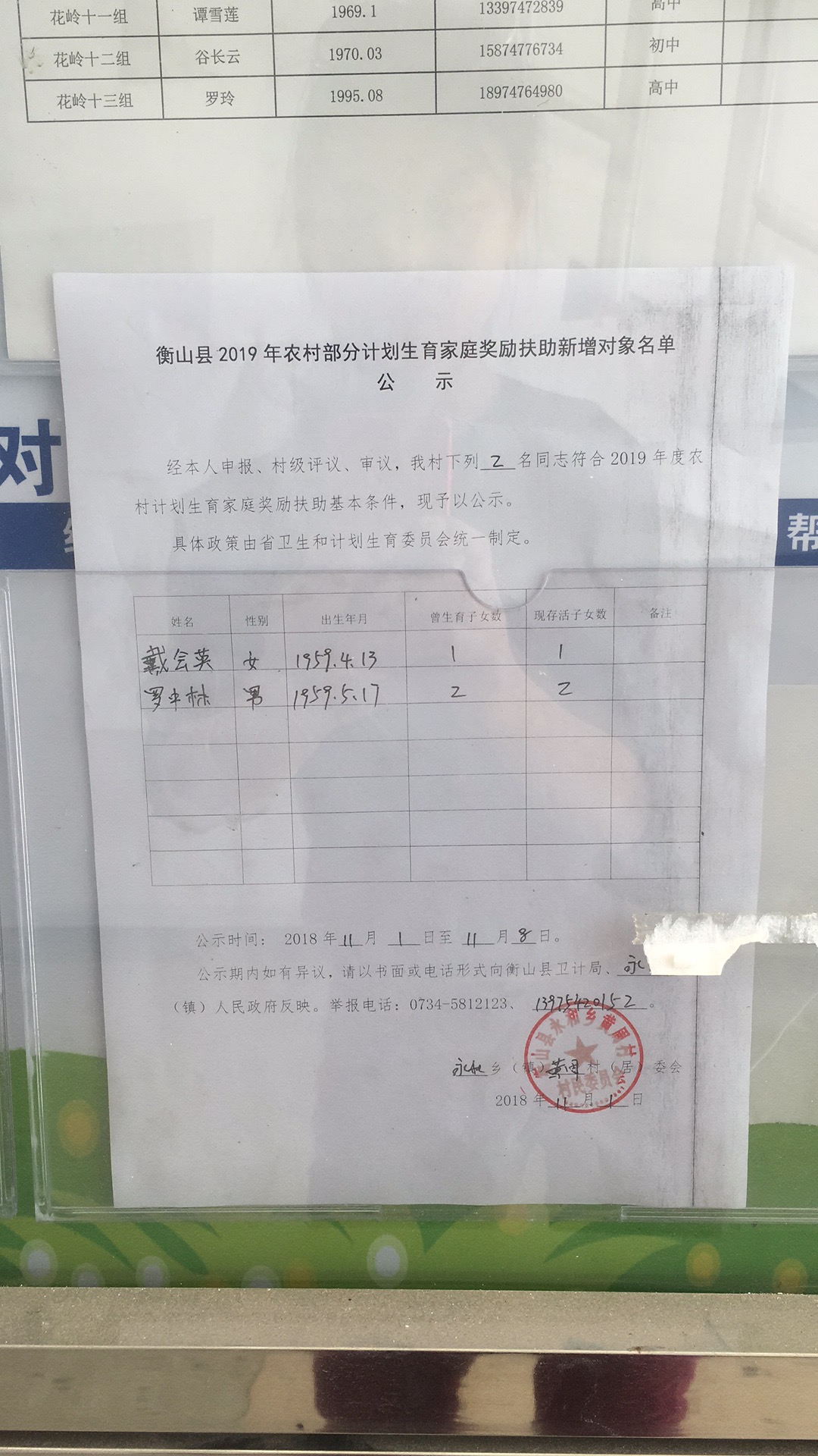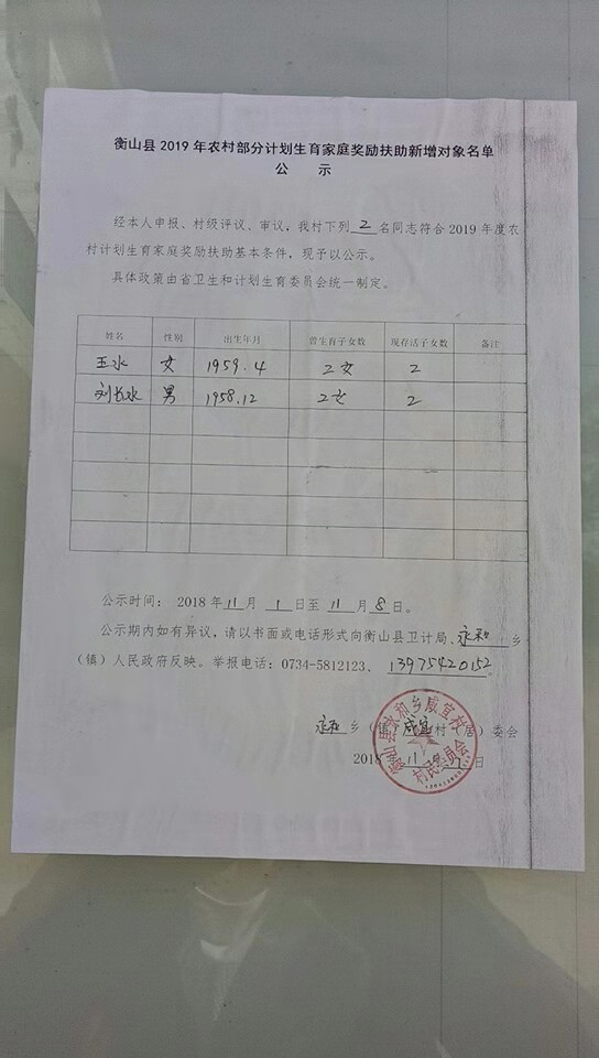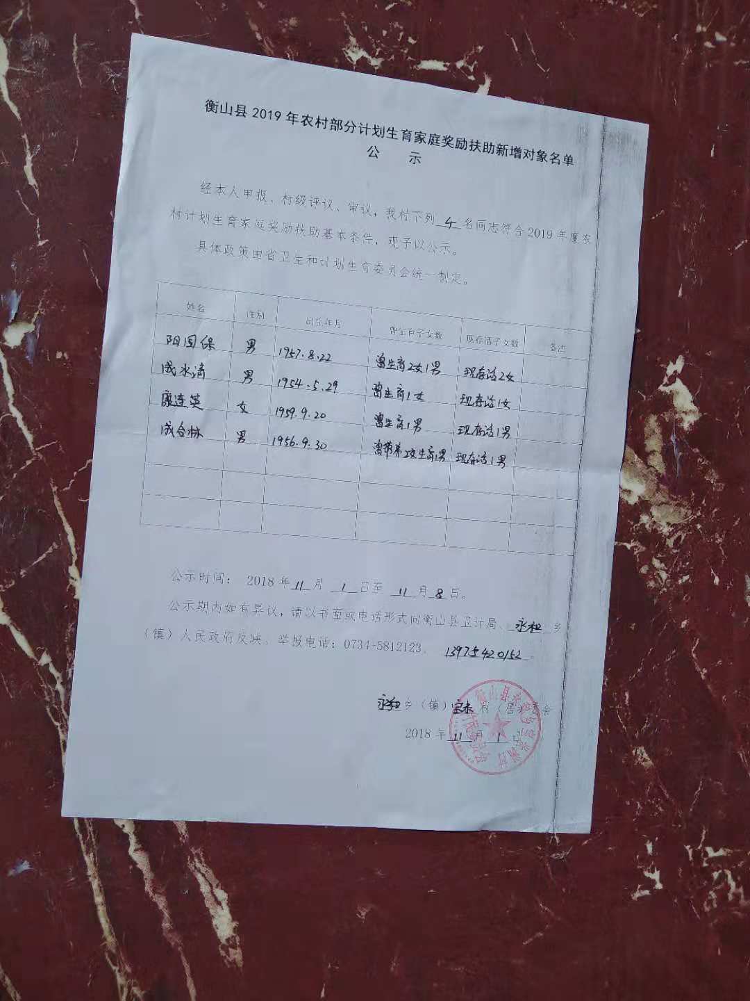 衡山县2019年农村部分计划生育家庭奖励扶助新增对象名单