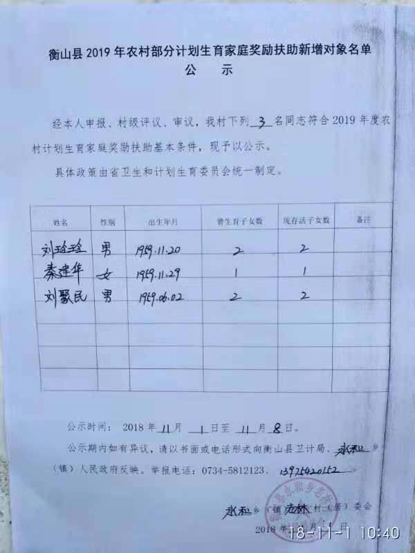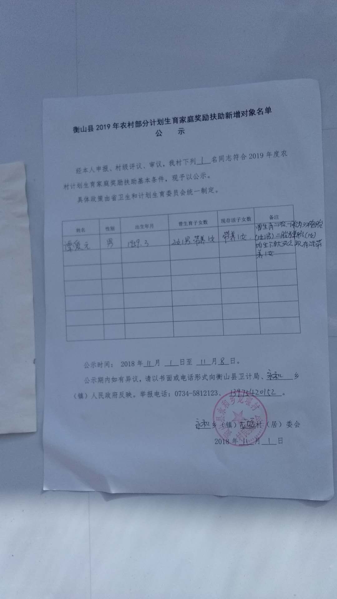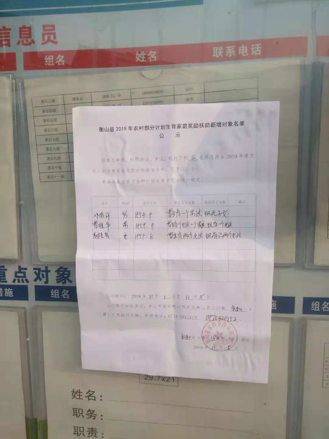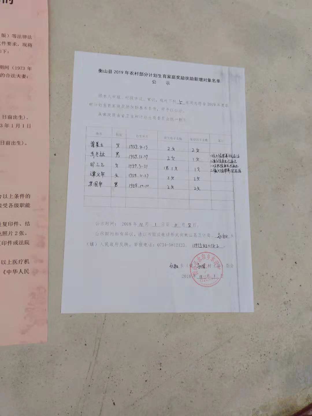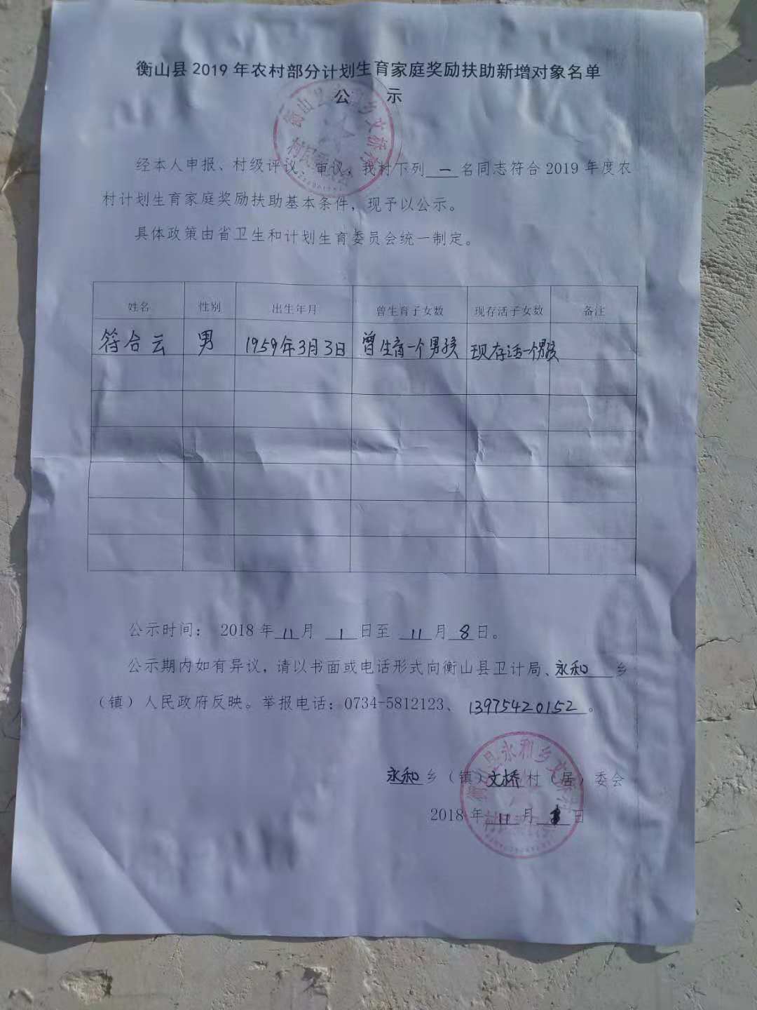 衡山县2019年农村部分计划生育家庭奖励扶助新增对象名单