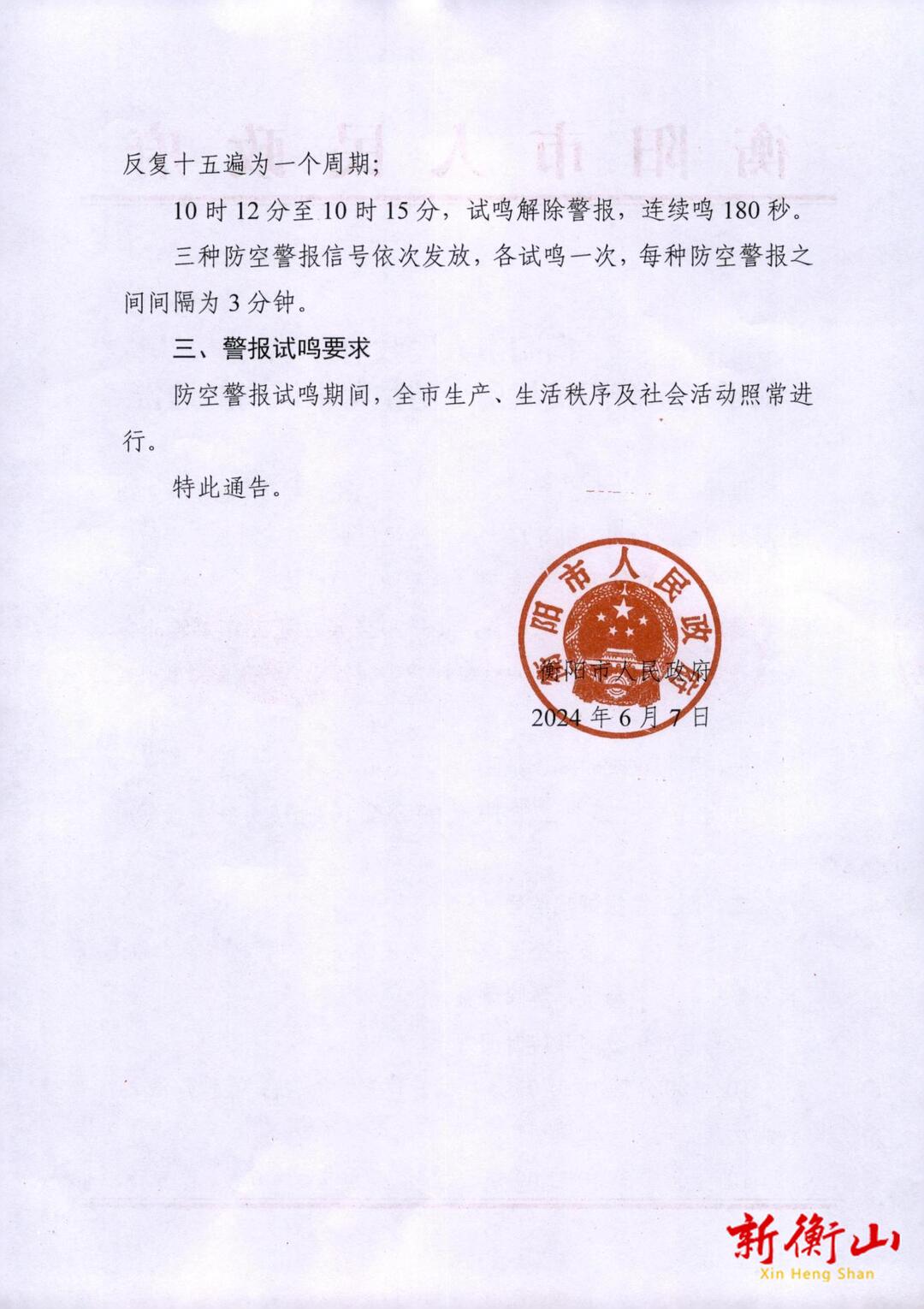 衡阳市人民政府关于纪念衡阳抗战历史防空警报试鸣的通告