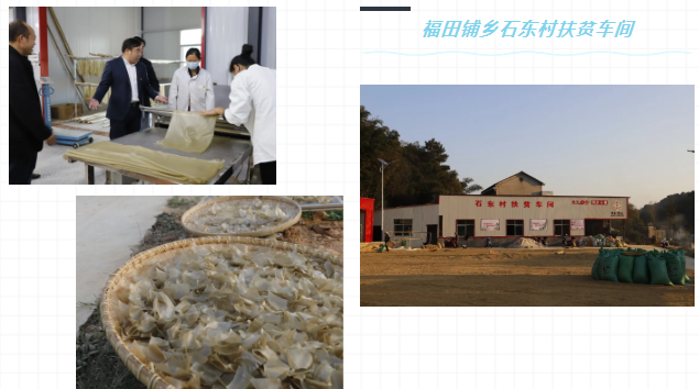 据悉,近年来,福田铺乡石东村走"造血式""开发式"扶贫的路子,大力推行"党支部+合作社+贫困户"模式,成立县内第一家网上村店,累计为贫困户销售农产品上百万元。建成250平方米的扶贫车间,年加工红薯120吨,产值42万元,利益联结贫困人口203人,安排贫困户就业10余人,村级集体经济年收入达13余万元。