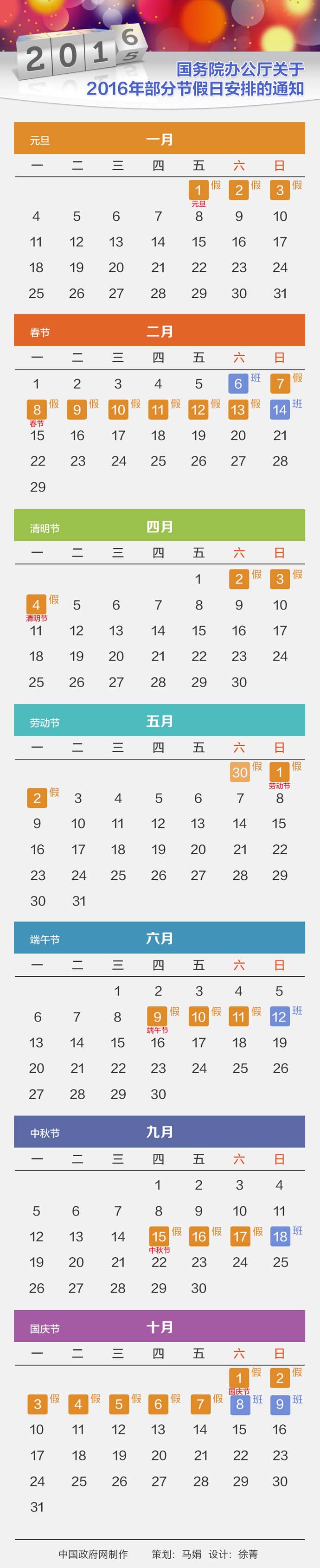 经国务院批准,现将2016年元旦、春节、清明节、劳动节、端午节、中秋节和国庆节放假调休日期的具体安排通知如下。