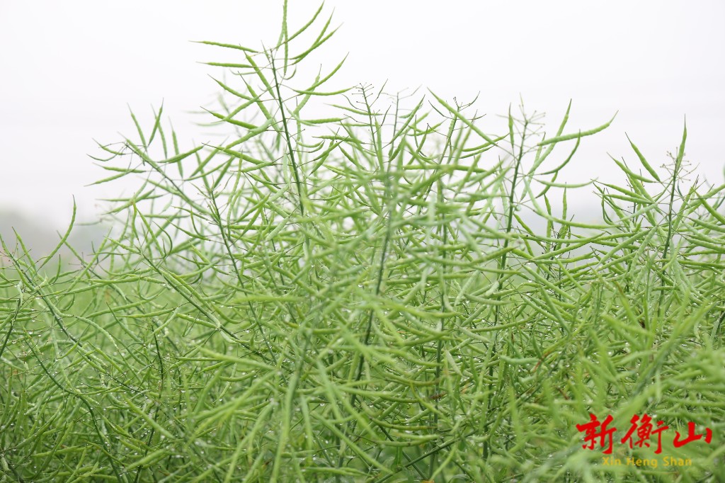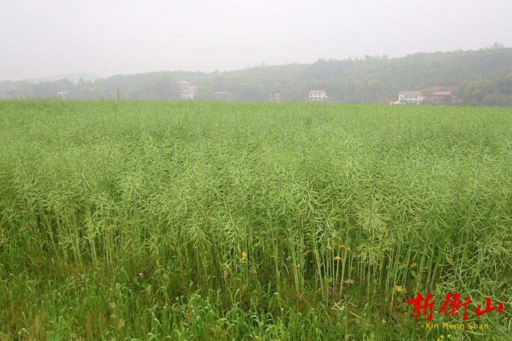 “油菜这个时期应该做好以下三点:首先是清沟排水,降低田间的湿度。第二要抢抓晴好天气,做好菌核病的防治,第三,因为现在是角果成熟期,要适当地增加磷钾肥,增加油菜的千粒重。”衡山县农业农村局高级农艺师胡伟指导基地负责人如何管护油菜。
