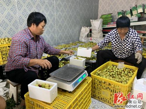 当天上午,记者在永和乡沙头村冬枣基地看到,一箱箱冬枣整齐有序的摆放在仓库内,十余名工人正在熟练地将冬枣进行打包、称重、装盒,在贴上中国邮政的物流单后,一盒盒具有“衡山特色”的冬枣即将运往全国各地。