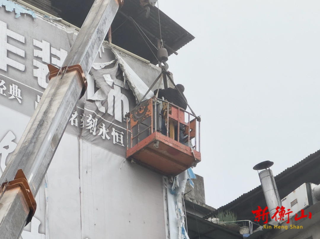 4月7日上午,记者在桥盛街看到,一幅破旧不堪的“巨无霸”墙体广告随意高空悬挂。执法人员组织专业施工队伍,并协调机械车辆,将其成功拆除。