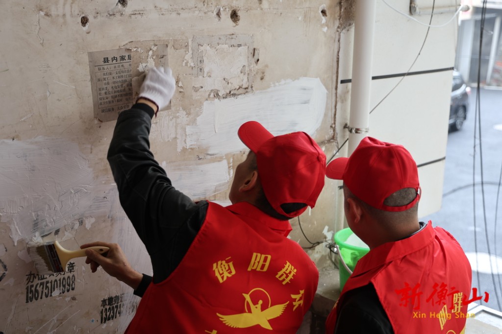 (衡山融媒志愿者们正在清除居民楼牛皮癣 刘星语 摄)