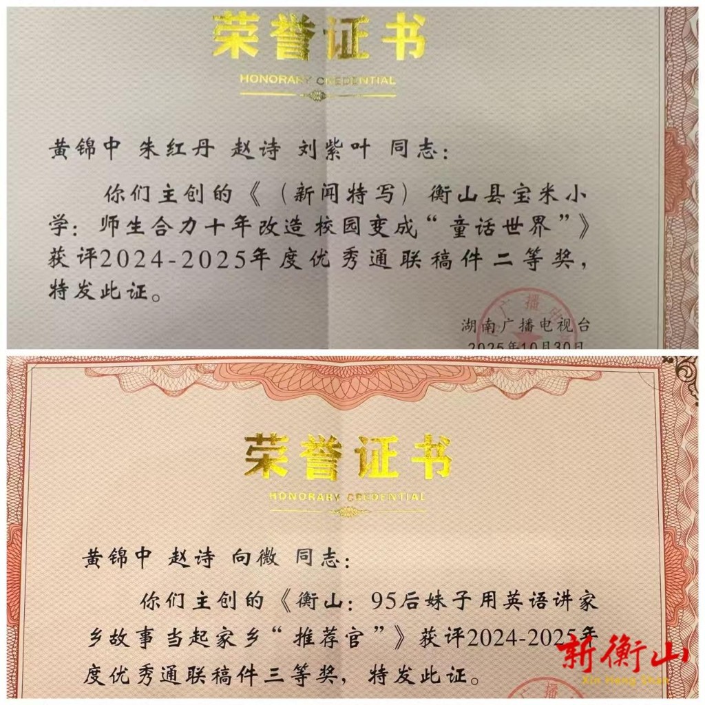 大会颁发了2024年度湖南广播电视台优秀通联集体、优秀通联个人、优秀通联作品等奖项。其中,由衡山县融媒体中心记者赵诗、刘紫叶创作的作品《(新闻特写)衡山县宝米小学:师生合力十年改造校园变成“童话世界”》获优秀通联稿件二等奖;记者赵诗、向微创作的作品《衡山:95后妹子用英语讲家乡故事当起家乡“推荐官”》获优秀通联稿件三等奖。