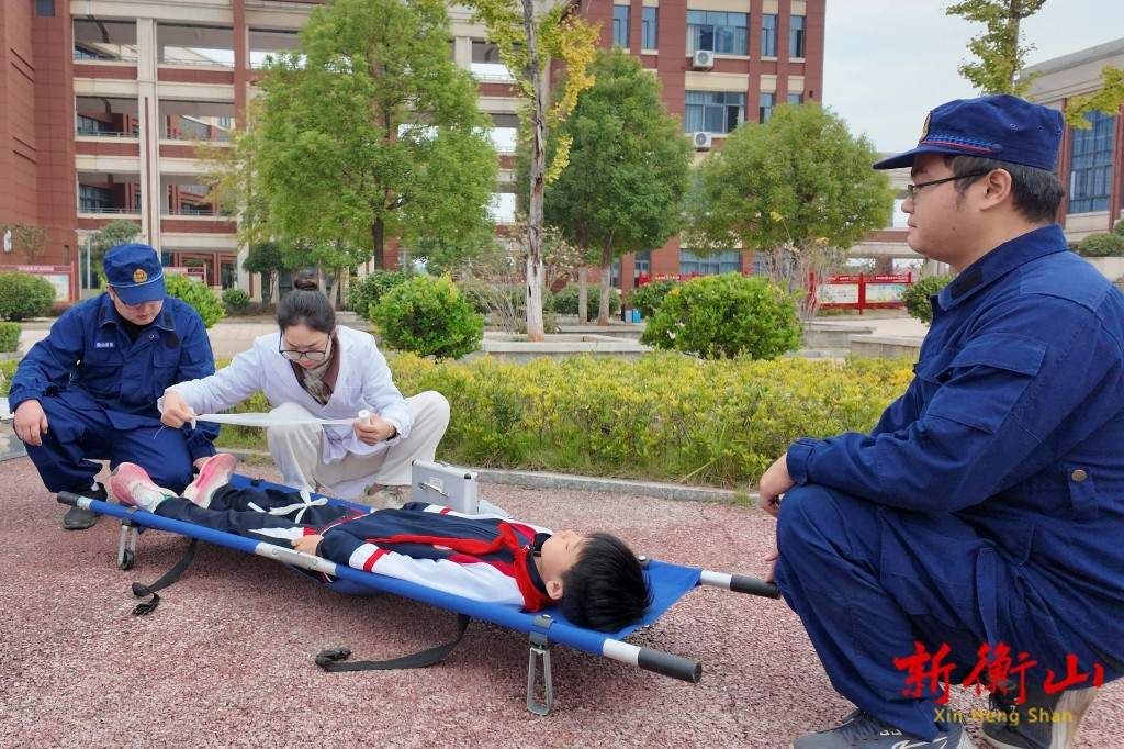 疏散演练结束后,衡山县应急管理局综合应急救援大队的工作人员现场模拟了“伤员”应急处置场景,通过专业演示讲解了伤口包扎等基础急救技能,让师生直观了解意外发生时的正确处置方法。