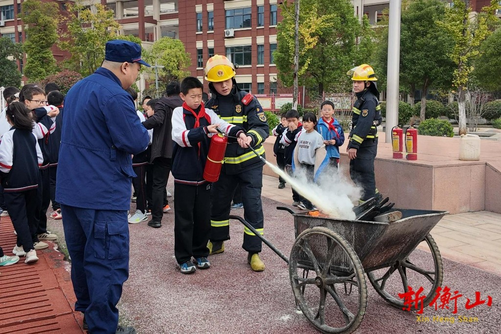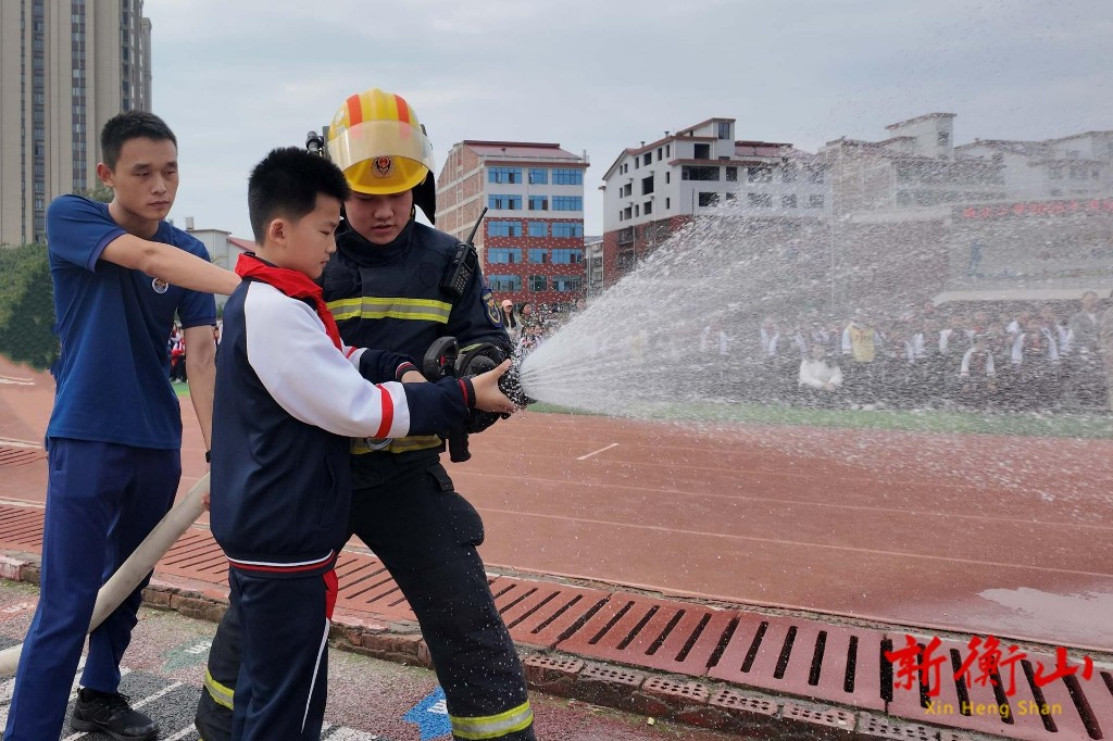 在衡山县消防救援大队消防员的指导下,师生代表依次拿起灭火器,对准火焰根部精准喷射,成功扑灭模拟火点。消防员还展示了高压水枪的操作方法,通过真实装备演示和趣味互动,让师生们在实践中加深了对消防器材的认识和使用熟练度。