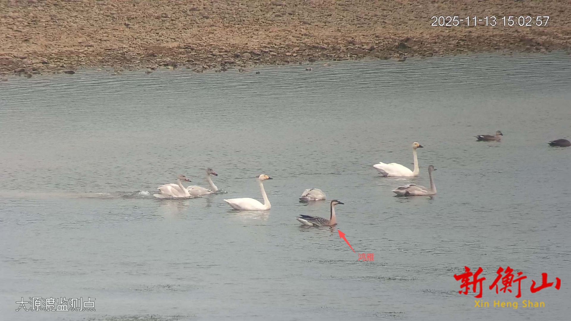 从监测设备可以看到,这只鸿雁正悠然漂浮在水面上,时而低头啄食水中的藻类与植物嫩芽,时而抬头梳理羽毛,灰褐色的体羽在阳光下泛着柔和的光泽。
