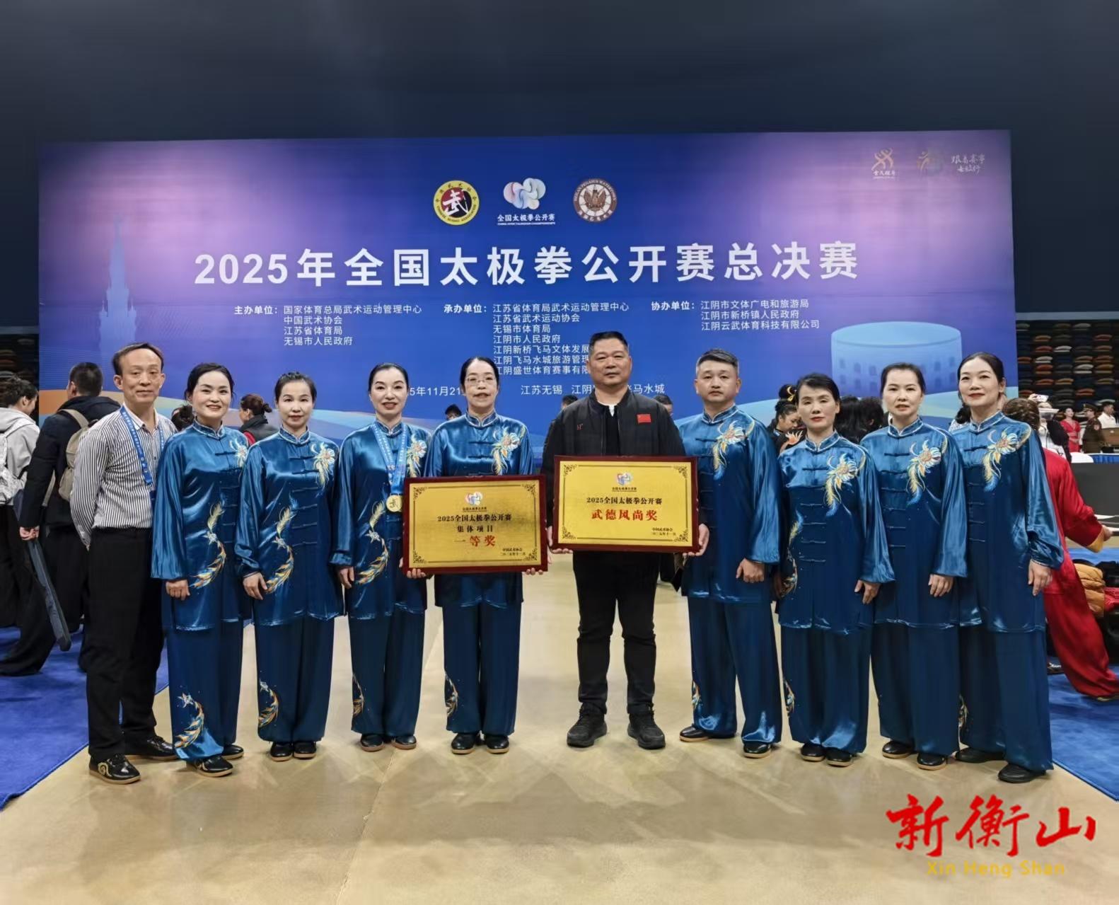 11月21日至26日,全国太极拳公开赛总决赛在江苏省江阴市飞马水城文体馆举行。 衡山县陈式太极拳协会在此次比赛中斩获集体项目一等奖、个人项目一等奖。