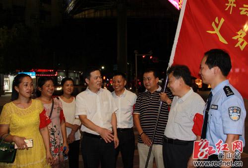 随后,尹培国沿着人民东路、解放北路、义安路、人民中路步行,他边走边看,不时和临街门店的店主、店员以及过往群众亲切交谈。在县城人民中路和五一北路交汇处,尹培国遇到了正在巡逻的先农社区义务巡逻员。尹培国向他们表示亲切的慰问,感谢他们对城区夜巡工作的支持和参与,希望他们继续发扬舍小家、为大家的奉献精神,为创建平安、和谐衡山贡献力量。同时,要求夜巡队员要加强对城区重点路段、重点区域的巡查,为人民群众安居乐业营造良好的社会治安环境。