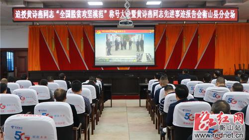 10月9日下午,追授黄诗燕同志“全国脱贫攻坚模范”称号大会暨黄诗燕同志先进事迹报告会在长沙举行。省委书记杜家毫、国务院扶贫办主任刘永富讲话,省委副书记、省长许达哲主持报告会。报告会以电视电话会议形式召开,各市州、县市区设分会场。县委书记尹培国,县委副书记、县长蒋青在衡山分会场出席。