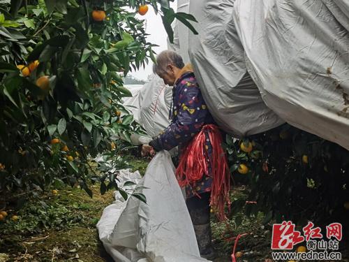 12月13日,衡山县永和乡龙凤村沃柑基地内,农户们正忙着给基地的千亩沃柑披上“防寒冬装”,在果树旁打下木桩,将防寒布覆盖至果树根部位置,再用绳子将布四周扎紧,防止大风天气把布吹开,提高沃柑的防寒抗冻能力。