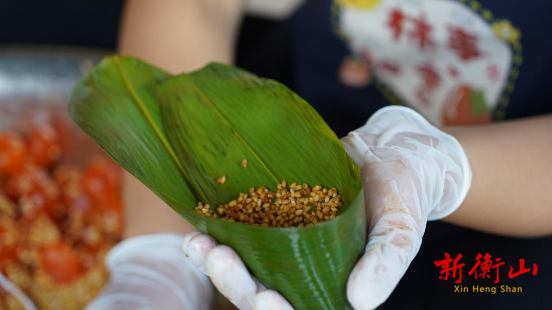 上午九点,将预定的粽子送到顾客手中,龙谦又开始了一天的“包粽子”生活。只见她取两片粽叶,将其卷成椭圆形,再放入糯米、肉和咸鸭蛋,将粽叶顶部卷下,迅速用线捆扎实。整套动作一气呵成,半分钟不到就包完了一个船粽。