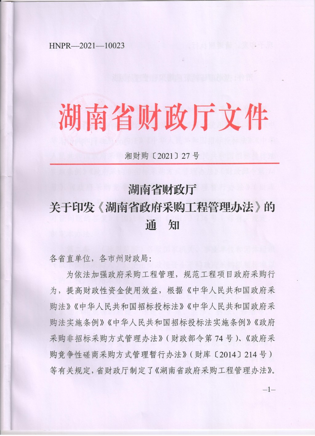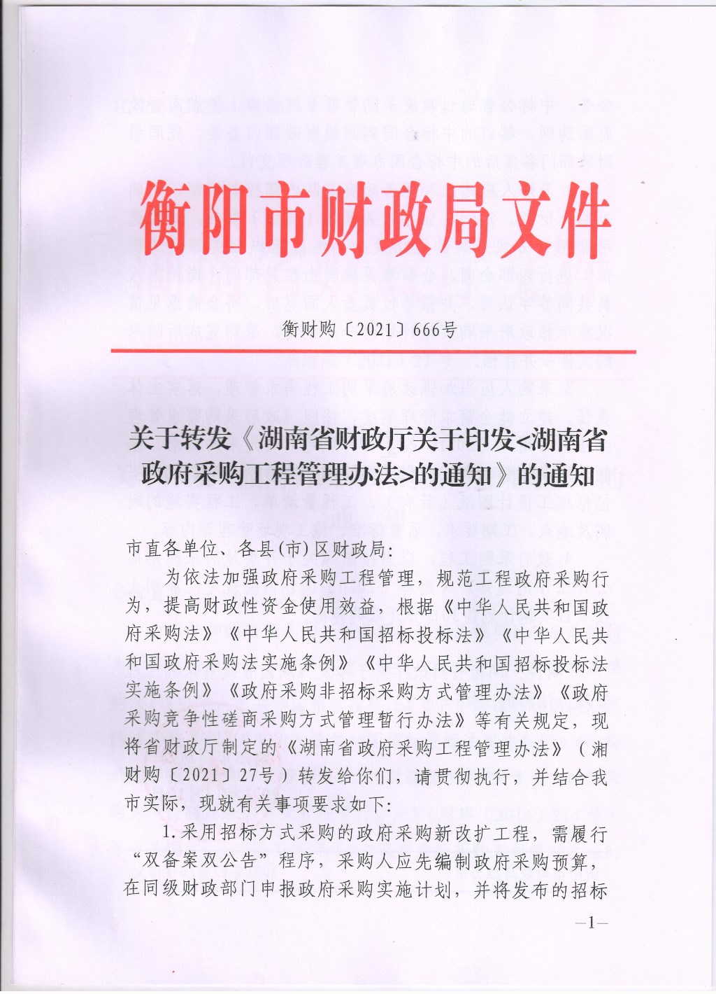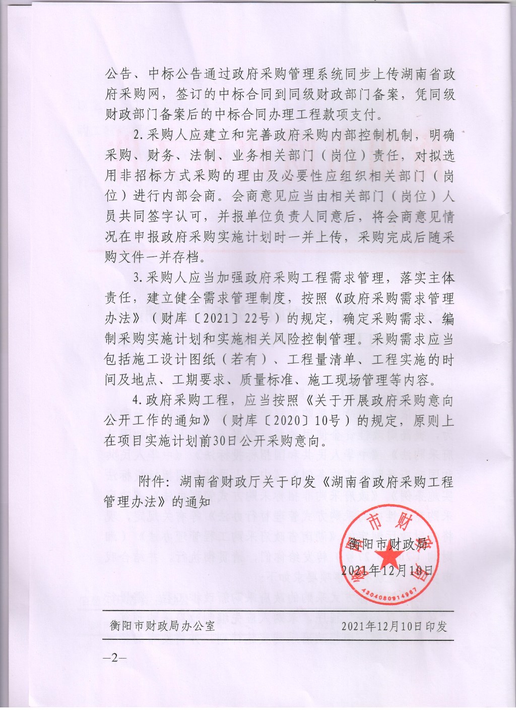 衡山县财政局关于转发《湖南省财政厅关于印发<湖南省政府采购工程管理办法>的通知》的通知