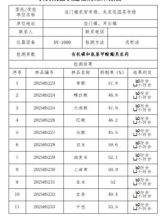 为确保“国庆﹒中秋”双节期间农产品质量安全,2025年9月28日县农产品质量安全检验检测中心对店门镇农贸市场、先农花园菜市场生产经营的蔬菜样品进行了农药残留抽样快速检验检测(对甲胺磷、甲拌磷、对硫磷、甲基对硫磷、氧乐果、毒死稗、氯氰菊酯、甲氰菊酯、氰戊菊酯、三氟氯氰菊酯、三唑酮、百菌清和乐果等20余种农药的综合含量进行快速检测),本次抽检蔬菜样品共36批次,其中合格样品36批次,抽检合格率为100%。(具体情况见附表)。