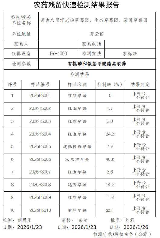 2026年1月19-23日县农产品质量安全检验检测中心对师古八里坪老杨草莓园、生态草莓园及豪哥草莓园的草莓样品进行了农药残留抽样快速检验检测(对甲胺磷、甲拌磷、对硫磷、甲基对硫磷、氧乐果、毒死稗、氯氰菊酯、甲氰菊酯、氰戊菊酯、三氟氯氰菊酯、三唑酮、百菌清和乐果等20余种农药的综合含量进行快速检测),本次抽检草莓样品共10批次,其中合格样品10批次,抽检合格率为100%。(具体情况见附表)。