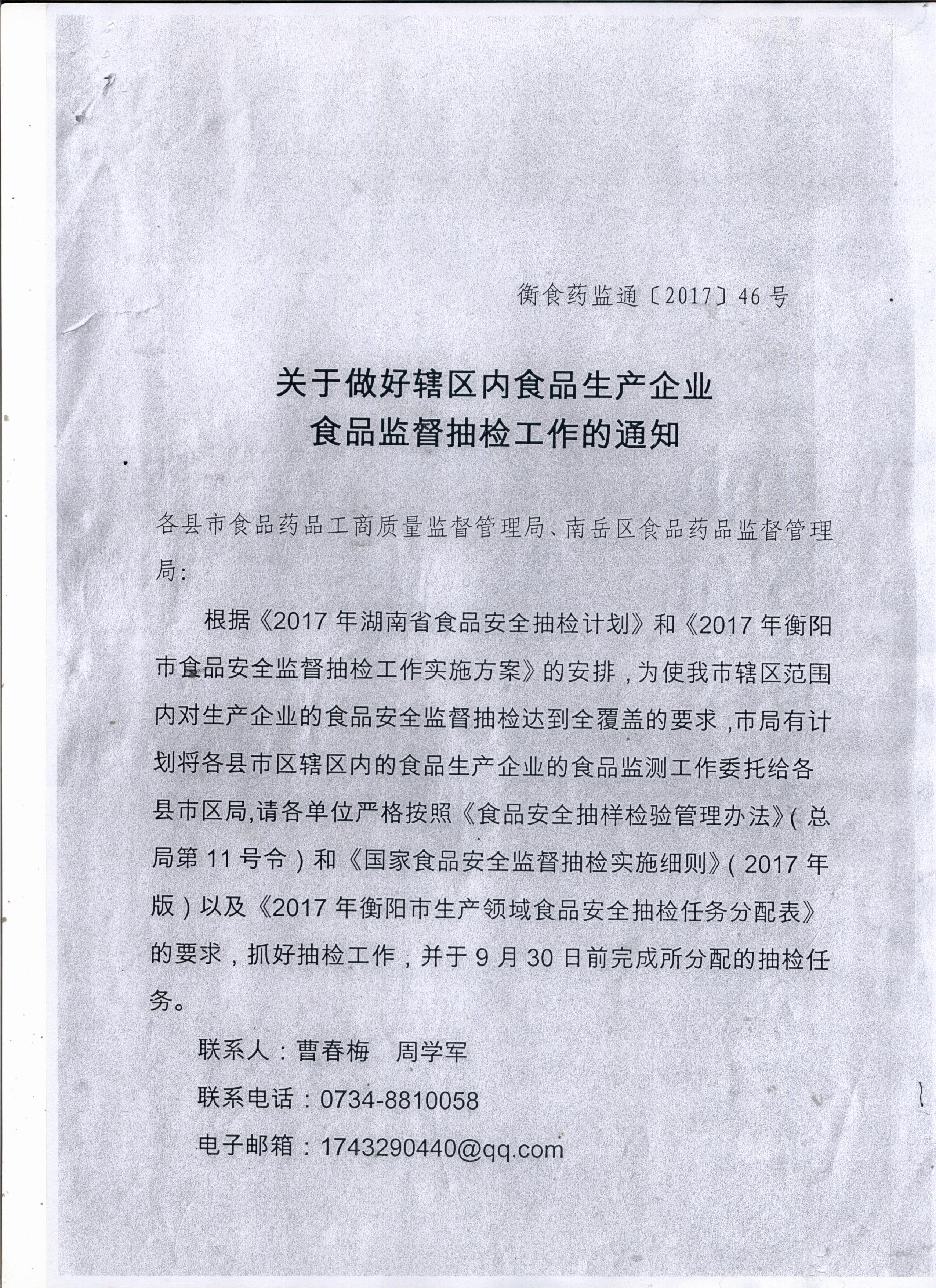 关于做好辖区内食品生产企业食品监督抽检工作的通知