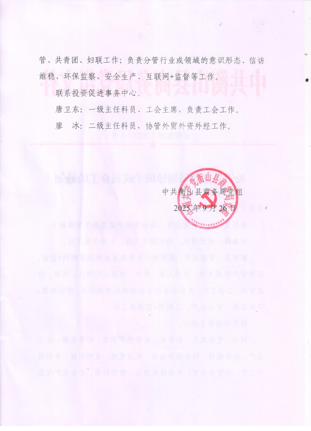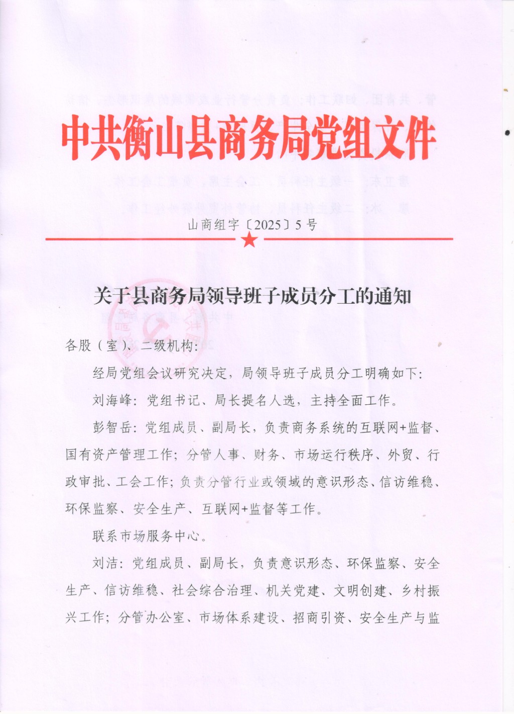 关于县商务局领导班子成员分工的通知