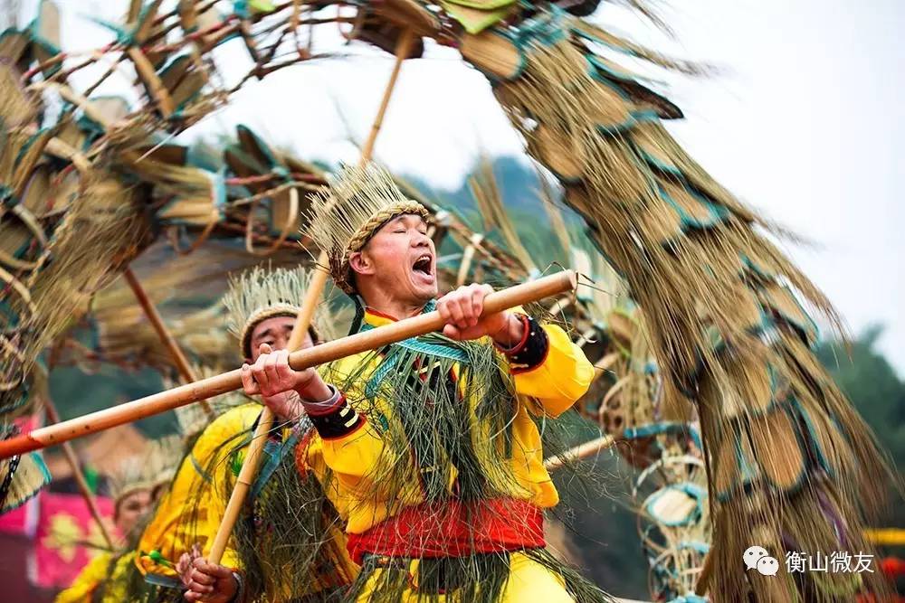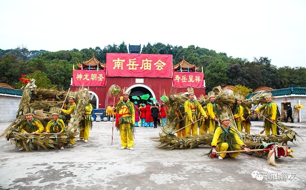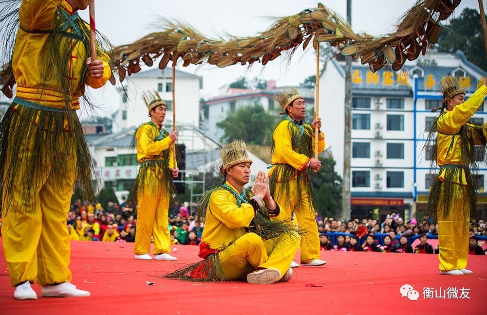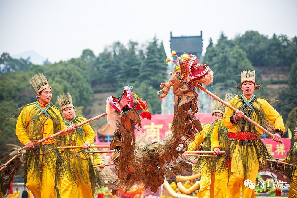衡山拜龙,相传起源于明朝初期,距今已有500多年历史,因以席草制作而成故又称席草龙。 “拜龙”(席草龙)出场,必是一公一母,加上一群龙子龙孙一起舞动,寓意雌雄相戏,万物繁茂。公龙和母龙均为九节,寓意“天长地久”。龙子龙孙为五节,寓意“五子登科”。 拜龙技艺特色鲜明,共八八六十四式,如天地合一、仰天拜佛、翻江倒海等,草龙舞动中加入行拜礼,独具特色。舞龙的人或仰拜、或跪拜、或行拜,仰拜拜天、跪拜拜地、行拜拜神灵、拜南岳菩萨,以此来祈求上苍的恩赐、神龙的怜悯、菩萨的保佑;并祈盼着来年风调雨顺,席草丰收、子孙兴旺。