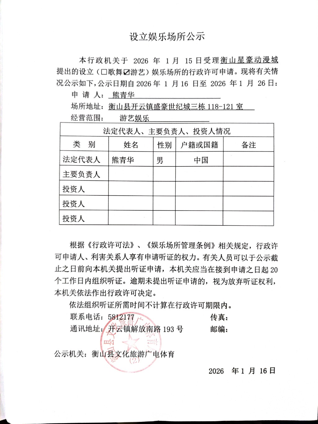 关于衡山星豪动漫城设立娱乐场所公示