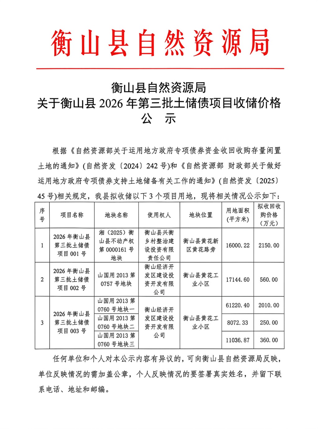关于衡山县2026年第三批次土储债项目收储价格公示