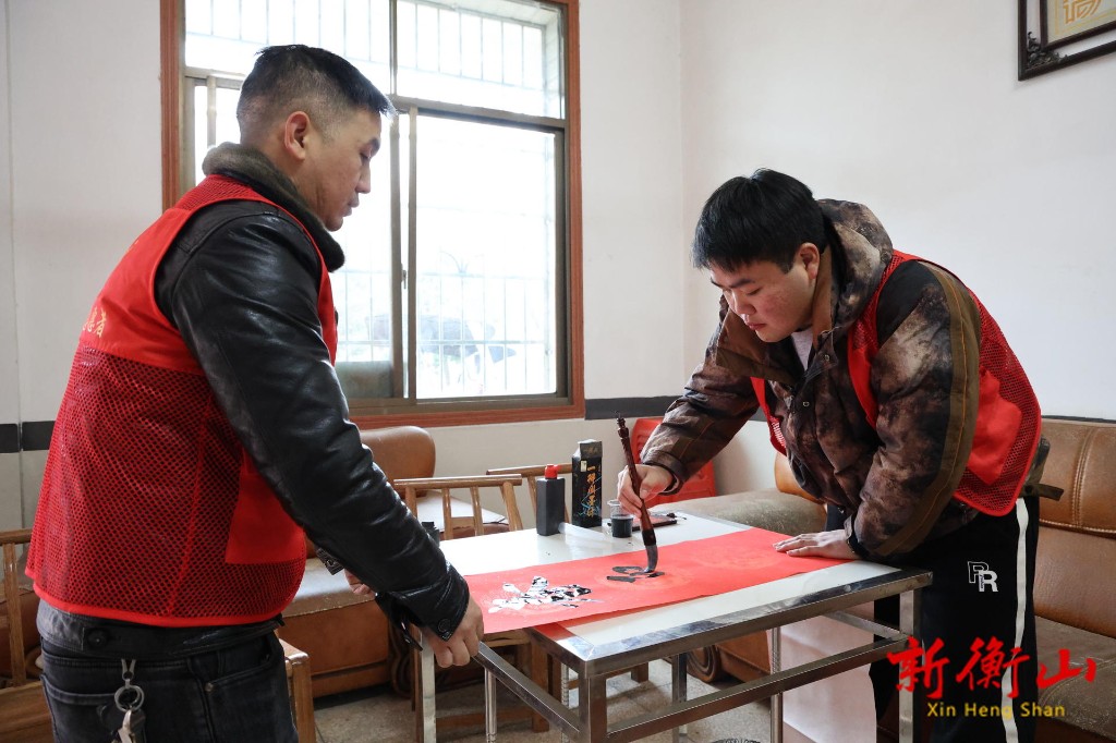 另一边,青年志愿者们挥笔不停,一副副寓意吉祥的手写春联新鲜出炉。大家将春联送到老人手中,还主动上门,为行动不便的高龄老人张贴,火红的春联贴满农家院落,也让整个村庄洋溢着喜庆祥和的节日氛围。