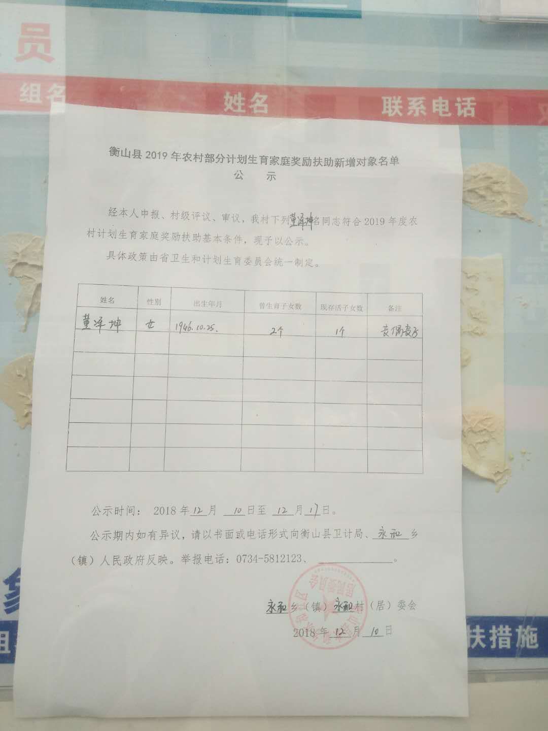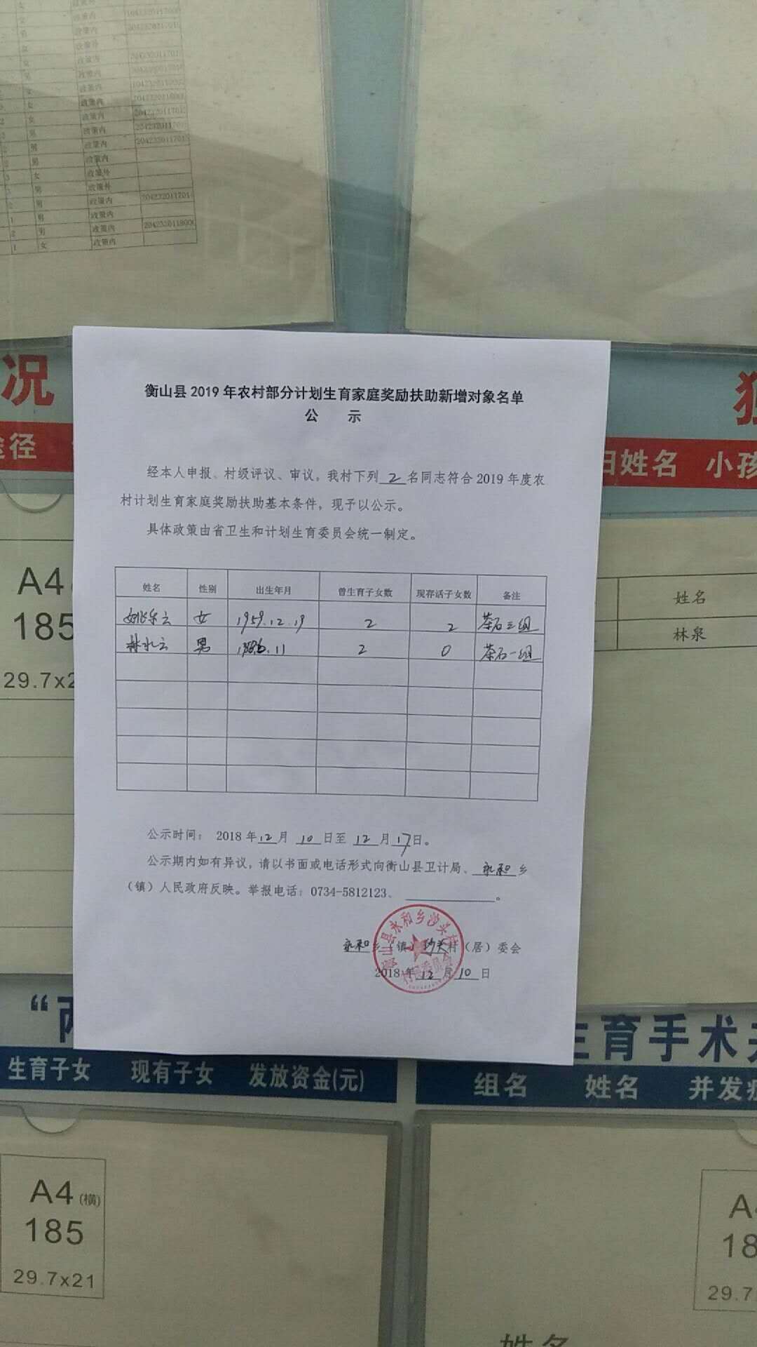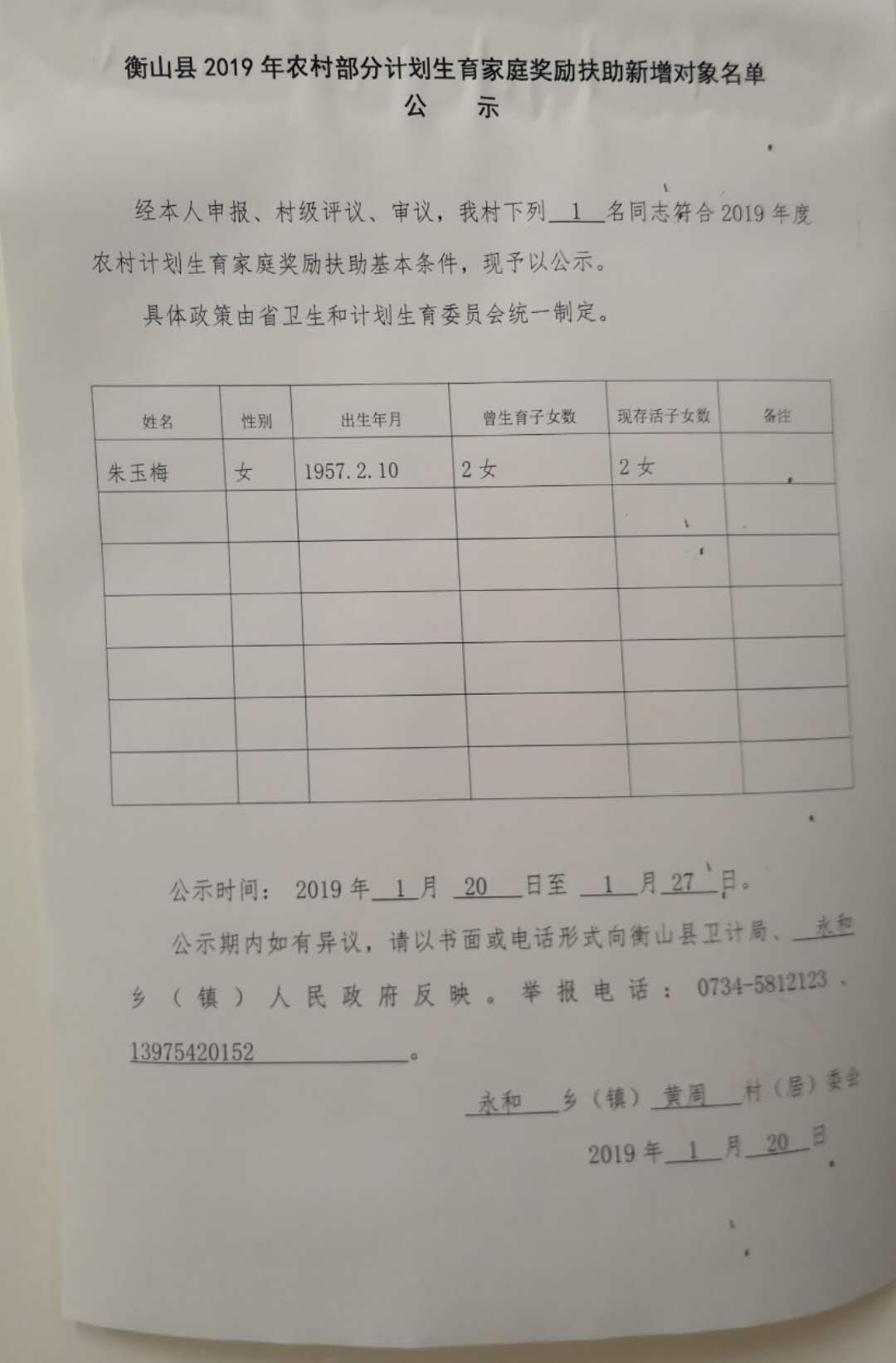 衡山县2019年农村部分计划生育家庭奖励扶助新增对象名单