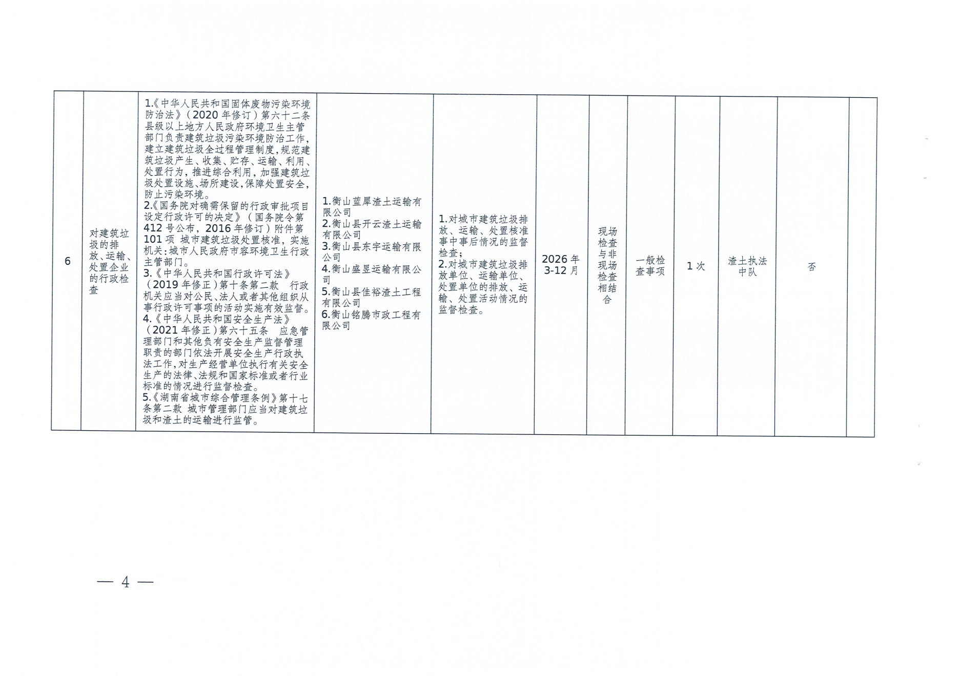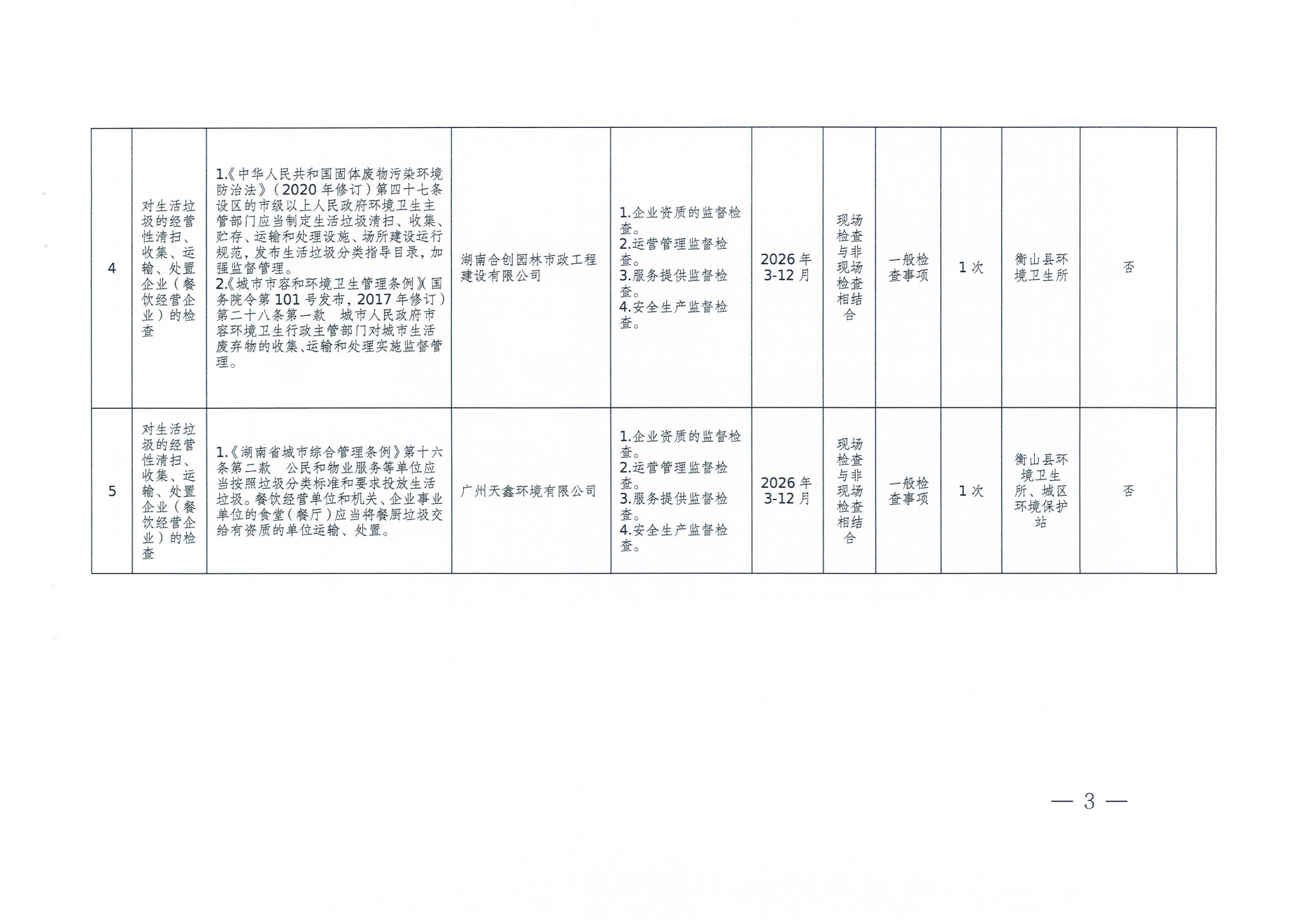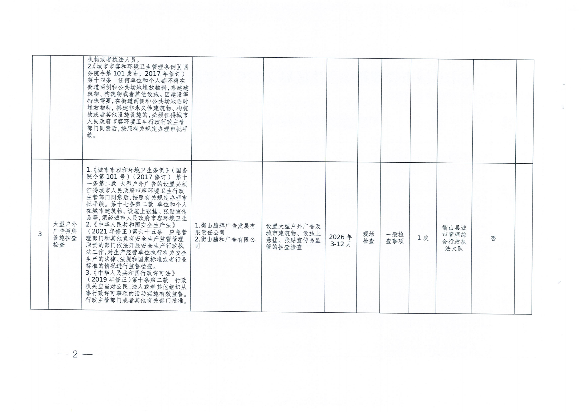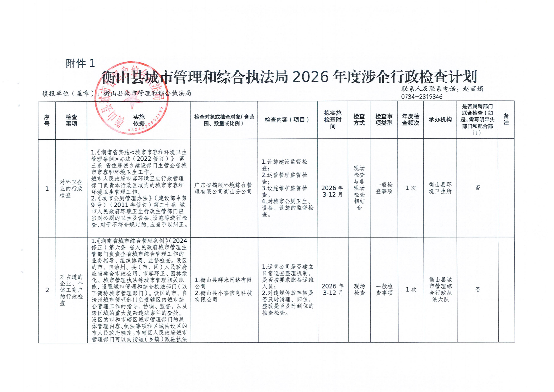 衡山县城市管理和综合执法局2026年度涉企行政检查计划