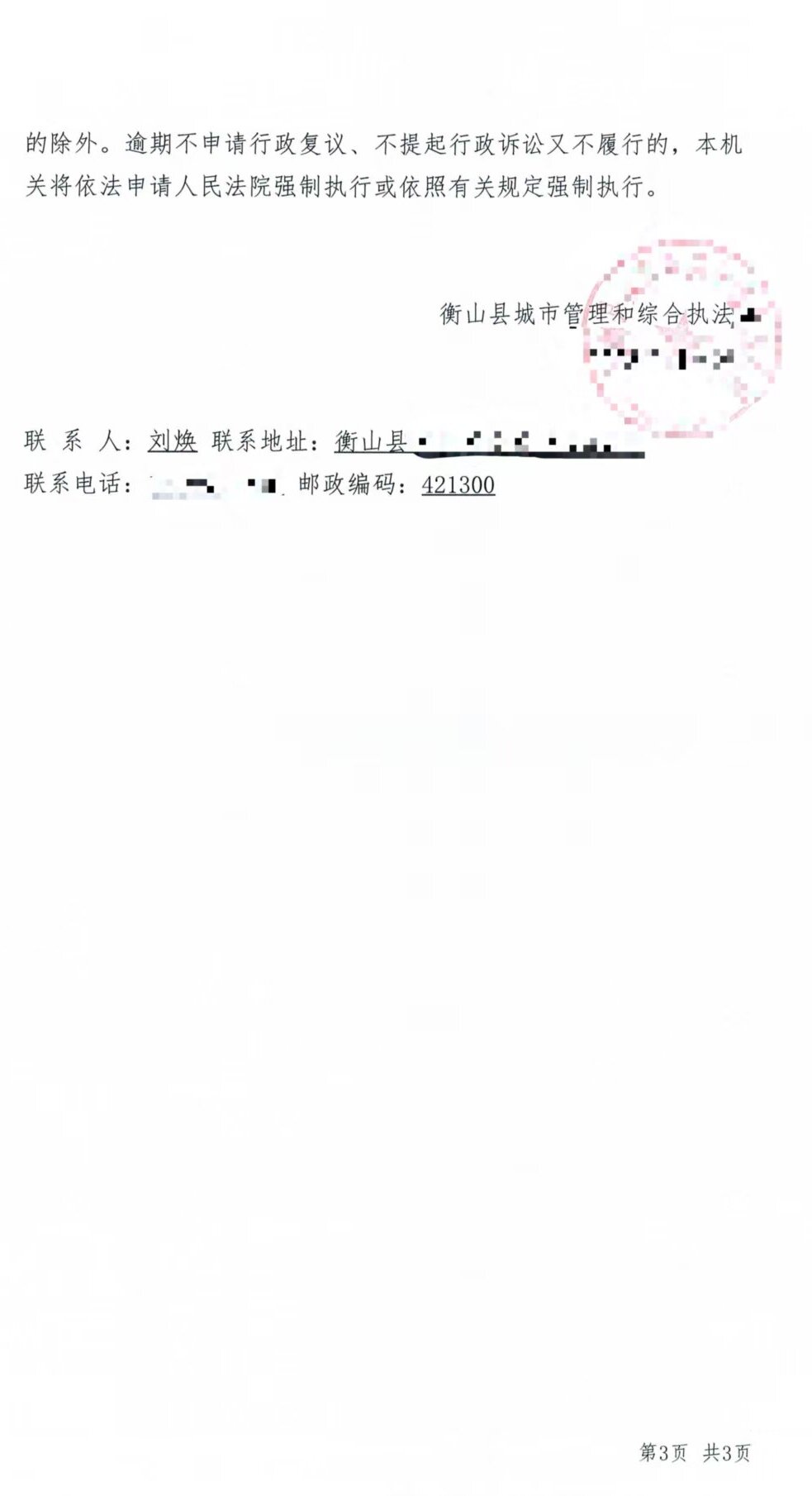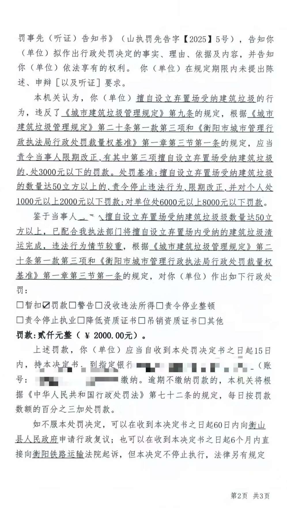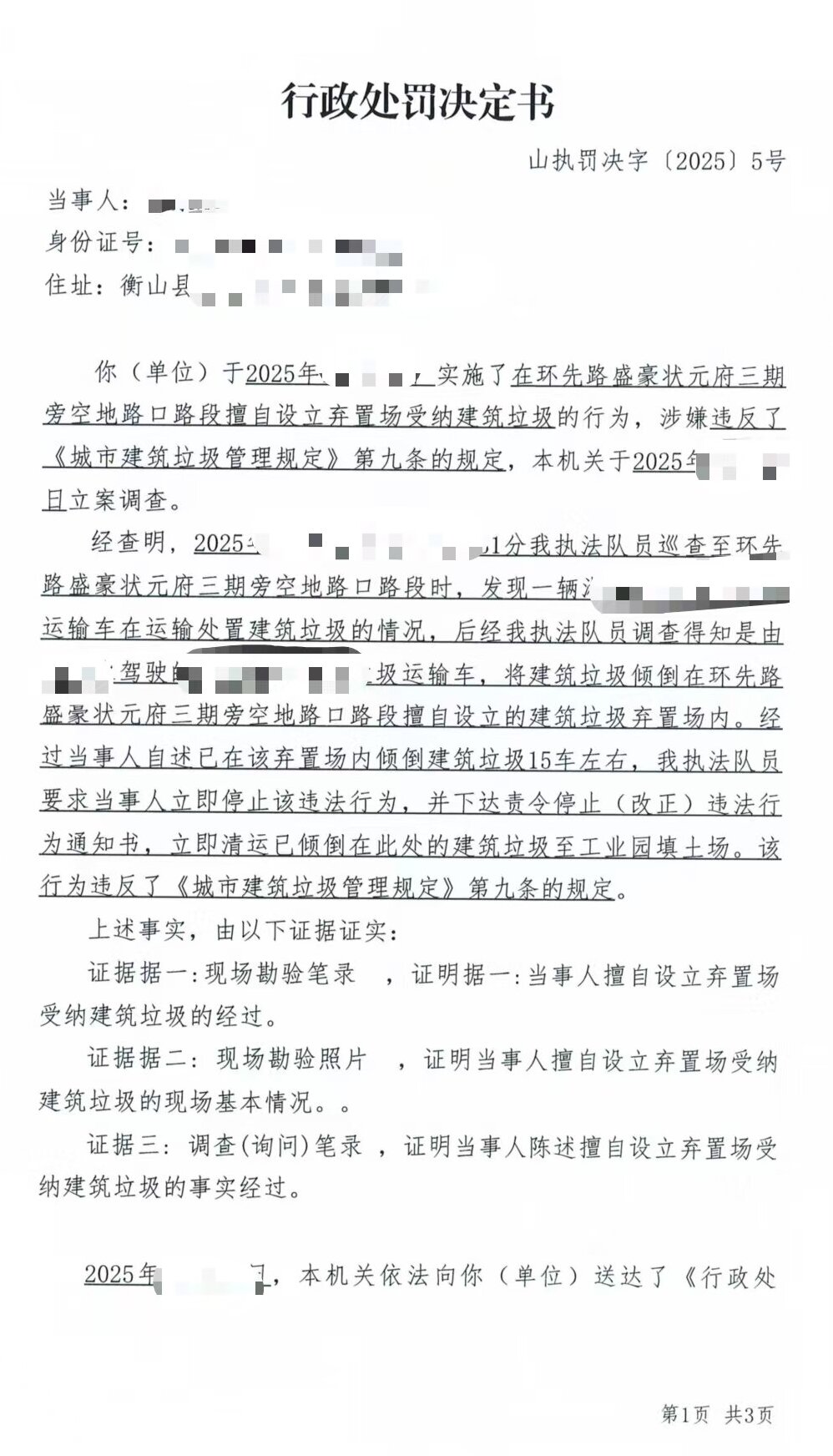 2025年11月3日,依据《城市建筑垃圾管理规定》第二十条第一款第三项"任何单位和个人有下列情形之一的,由城市人民政府市容环境卫生主管部门责令限期改正,给予警告,处以罚款:(三)擅自设立弃置场受纳建筑垃圾的"的规定,衡山县城市管理和综合执法局对陈某某作出《行政处罚决定书》,责令立即停止违法行为,限期整改,并处罚款人民币贰仟元整(¥2000)。