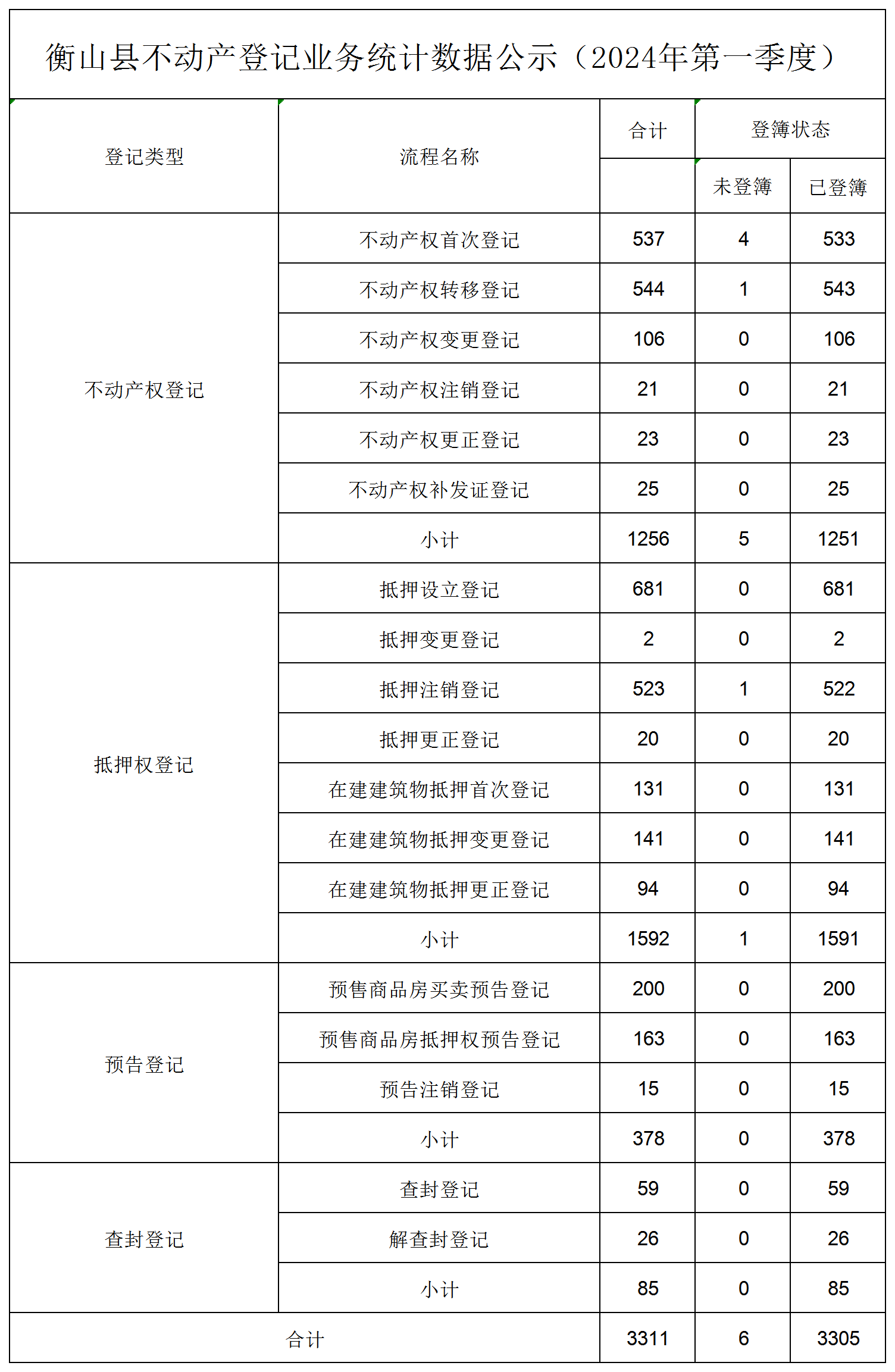 衡山县不动产登记业务统计数据公示(2024年第一季度)