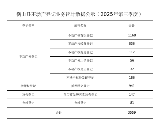衡山县不动产登记业务统计数据公示(2025年第三季度)